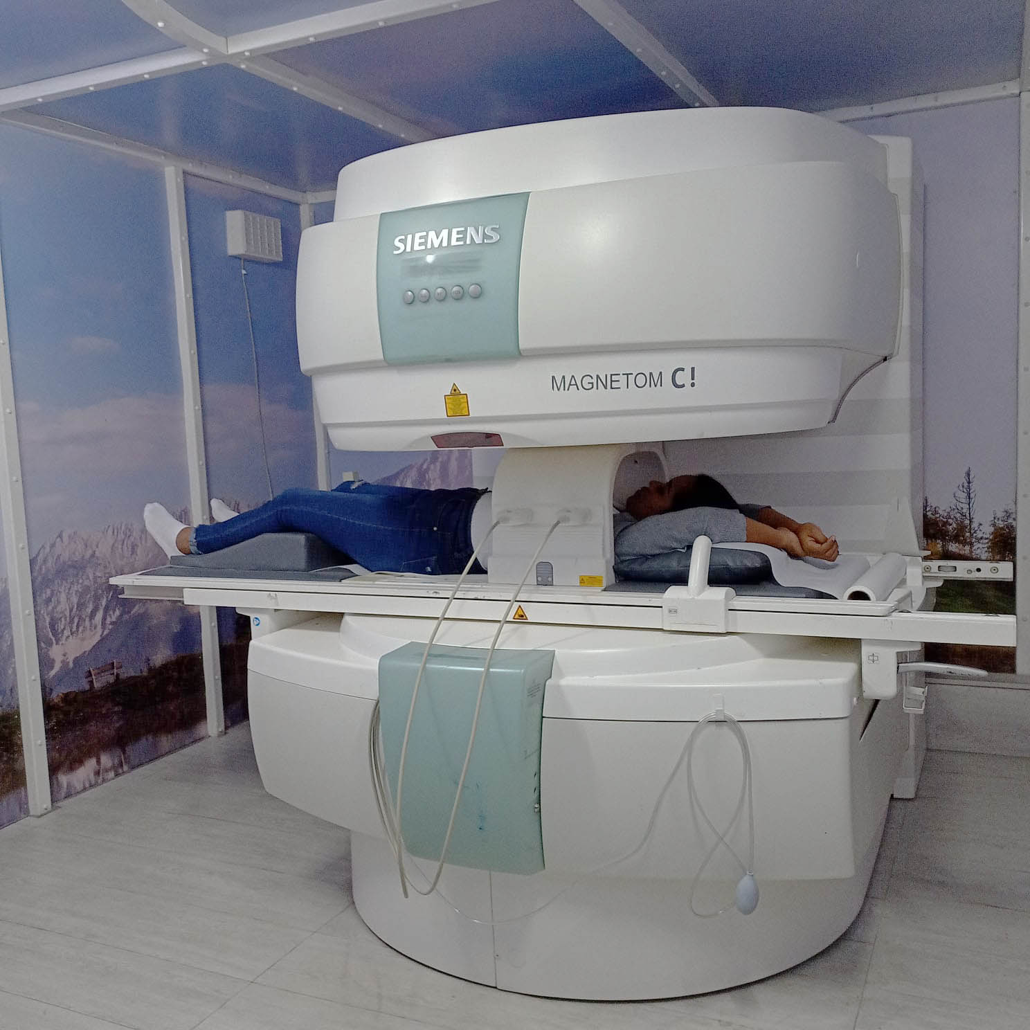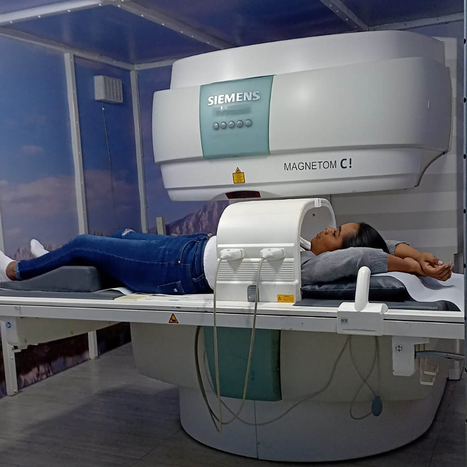 Acostado sobre su espalda en la mesa del equipo, con los brazos extendidos sobre  su cabeza y lleva en su tórax una antena que ayudará al equipo a obtener las imágenes  necesarias para su diagnóstico.